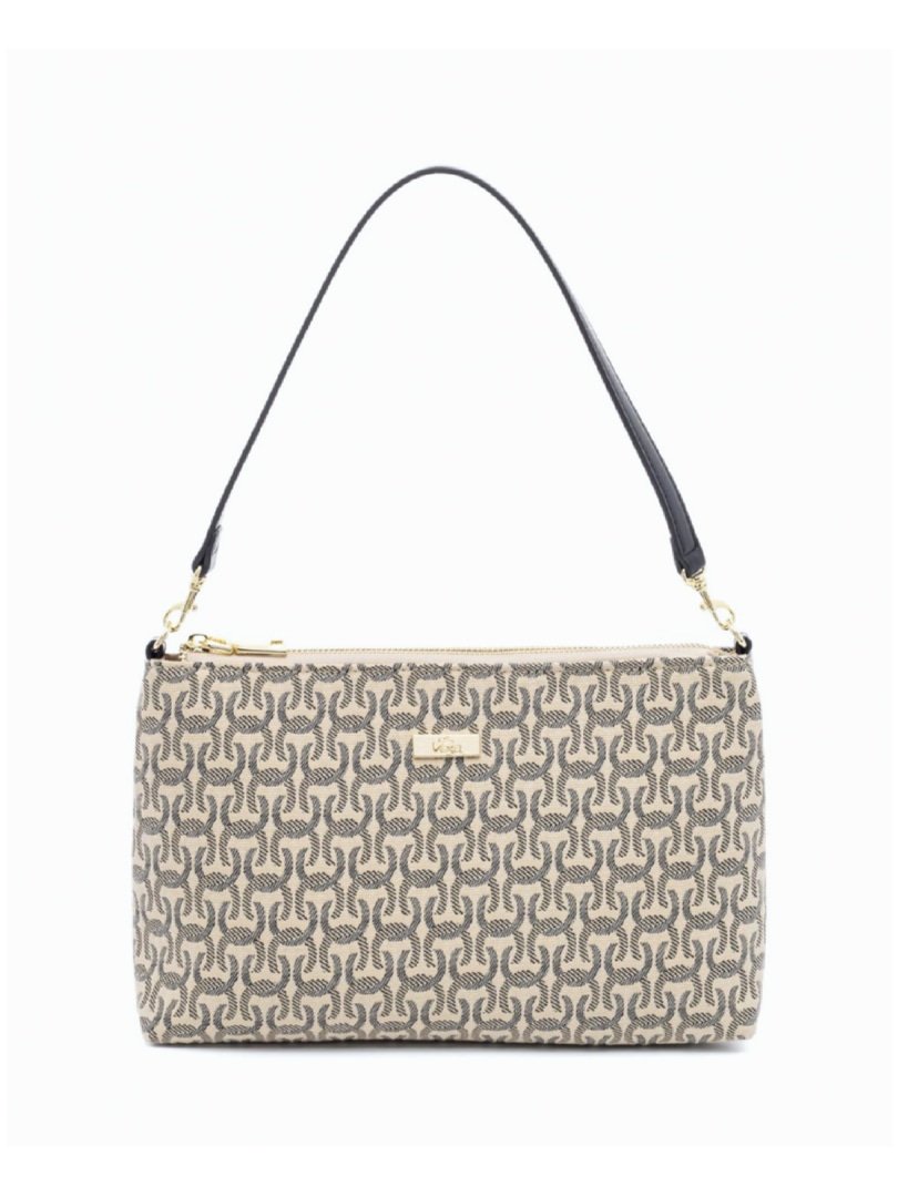 Τσάντα ώμου μπεζ σε συνδυασμό με μαύρο μοτίβο.
