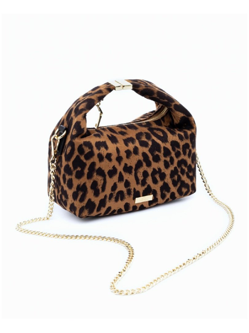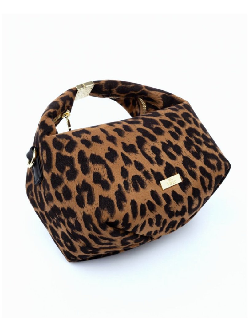 Τσάντα χιαστί σουέντ καφέ λεοπάρ με ιδιαίτερο μεταλλικό κούμπωμα στο χερούλι.