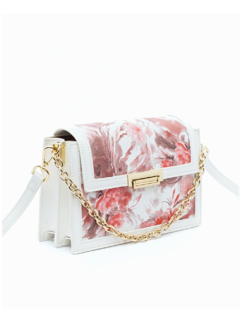 Τσάντα χειρός και χιαστί λευκή με ροζ φλοραλ και χρυσή αλυσίδα.