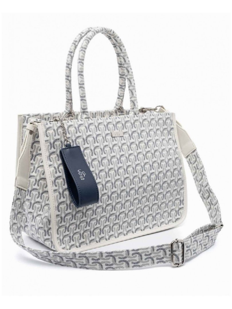 Τσάντα χειρός λευκή σε συνδυασμό με μπλε και γκρι μοτίβο.
