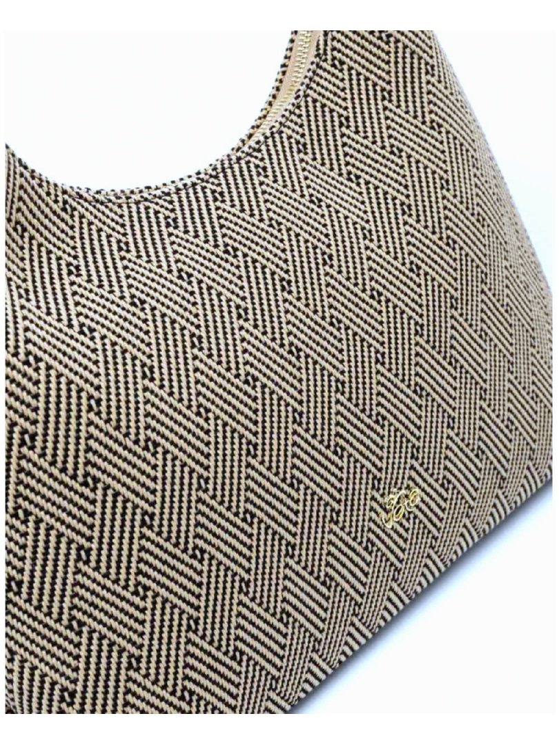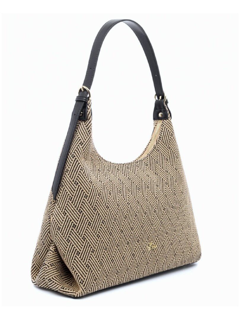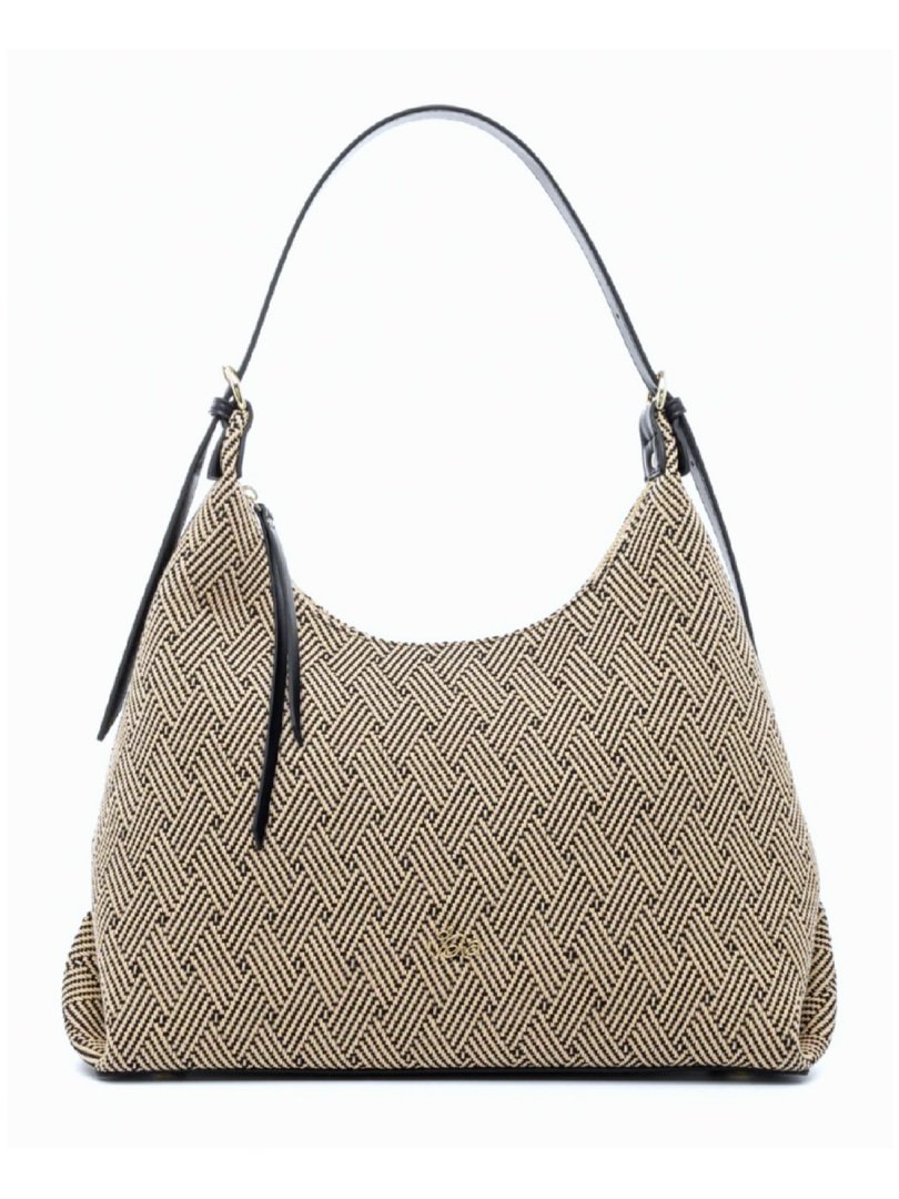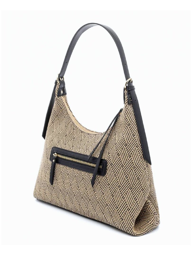 Τσάντα ώμου με μπεζ ψάθα και μαύρες λεπτομέρειες.
