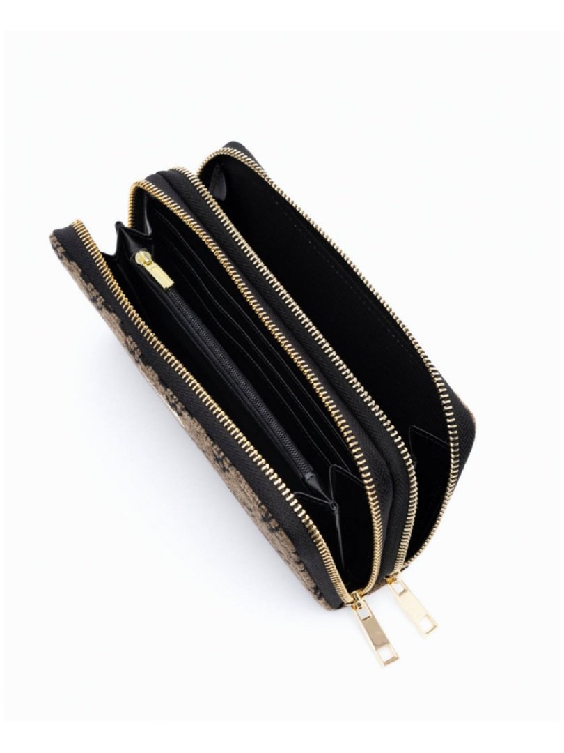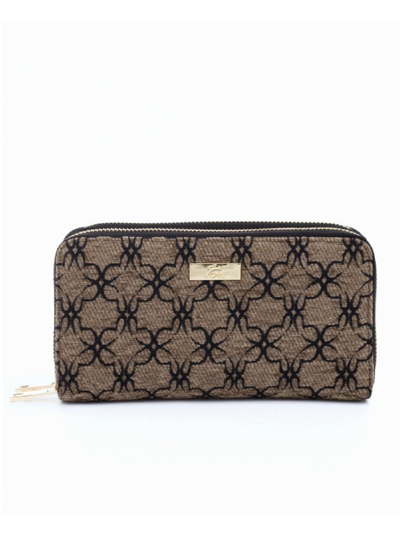 Πορτοφόλι υφασμάτινο μπεζ βελούδινο με μαύρο μοτίβο λογότυπου Veta και διπλό φερμουάρ.